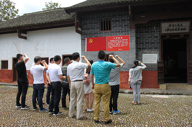 隨后,一行人到達(dá)水口鎮(zhèn)連隊(duì)建黨舊址。水口鎮(zhèn)連隊(duì)建黨舊址——葉家祠1972年被公布為湖南省重點(diǎn)文物保護(hù)單位,已被定為株洲市愛(ài)國(guó)主義教育基地。祠堂門(mén)口懸掛著鮮明的黨旗及入黨誓詞,肅穆莊嚴(yán),公司黨員在此重新宣讀入黨誓詞,內(nèi)心激動(dòng)澎湃的感情溢于言表。誓詞提醒著每一位黨員的承諾與信仰,他們將牢記自己的使命,從群眾中來(lái)到群眾中去,發(fā)揮黨員帶頭作用。